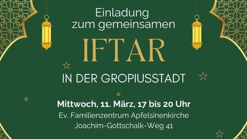 Lasst uns gemeinsam das Fastenbrechen feiern. Alle Gäste bringen bitte einen Beitrag zum Buffet mit.